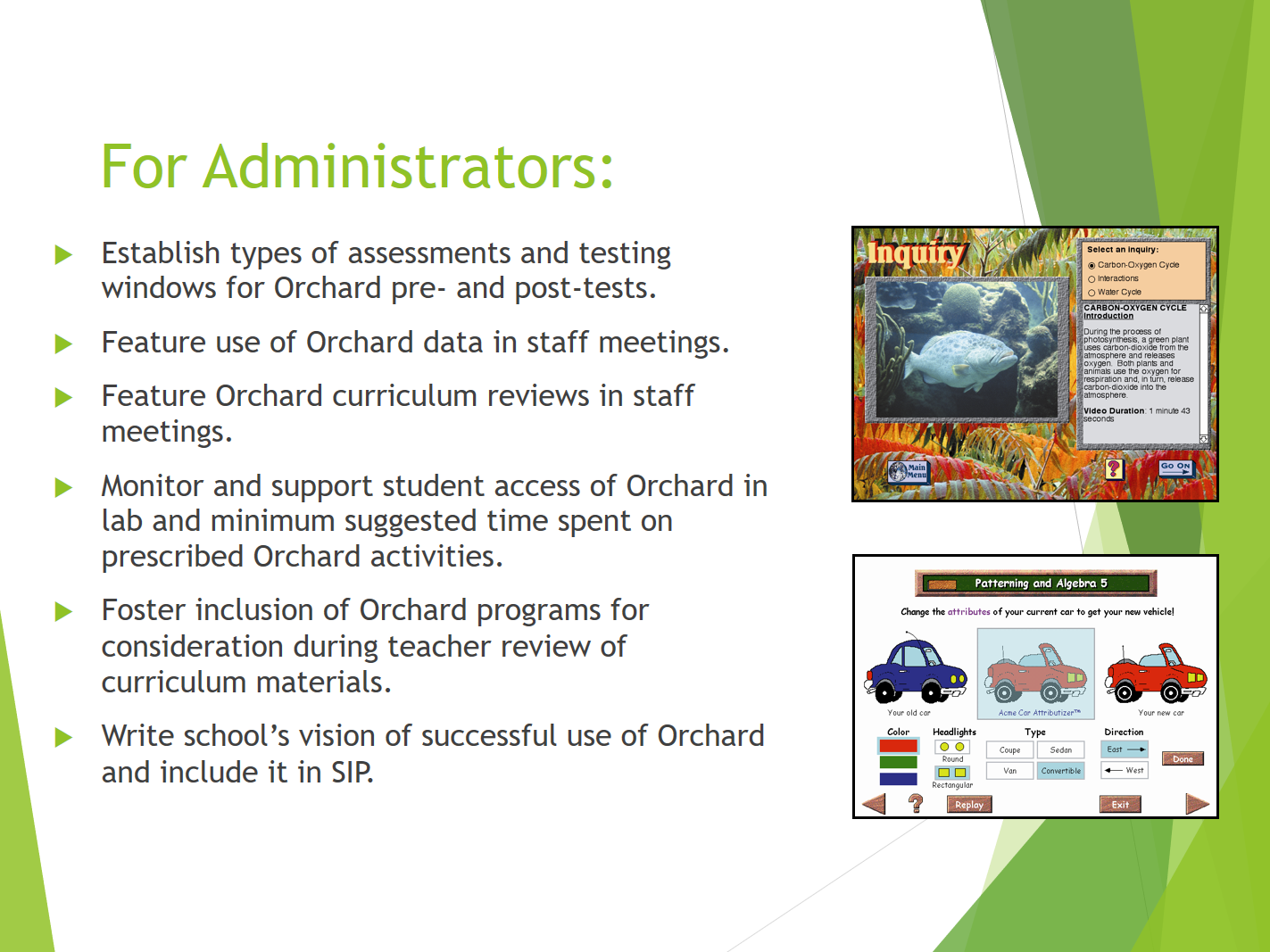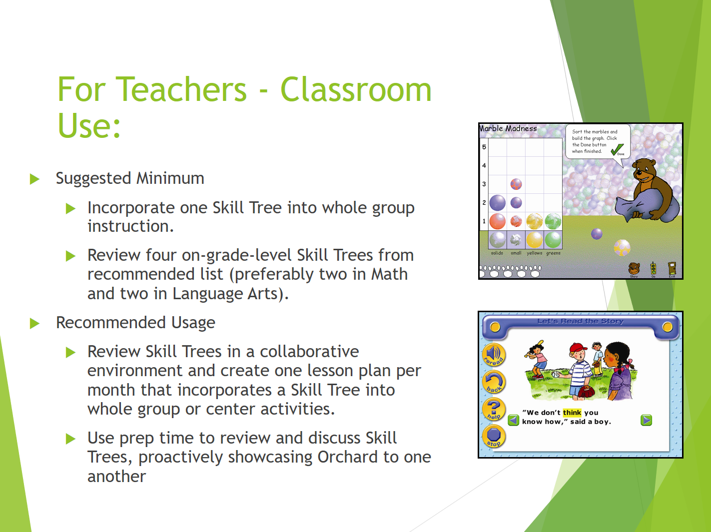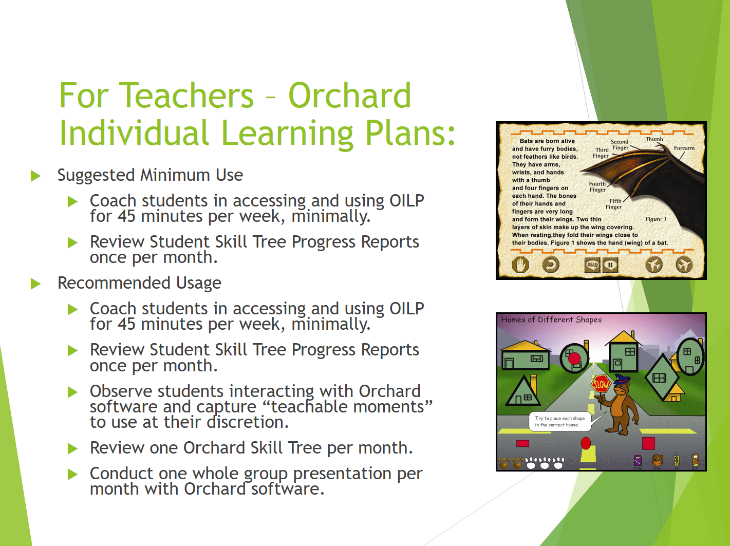 The goal of the training guides is to provide you with the basic knowledge you need to effectively integrate into your curriculum. By completing a series of key activities, you will learn how to navigate the programs, modify program parameters according to your students’ individual needs, and use data from Orchard’s reports to inform instruction. Each of these activities include step-by-step instructions and screenshots as well as helpful annotations that contain classroom implementation ideas, program notes, and/or alerts to strategies for successful use of the programs.